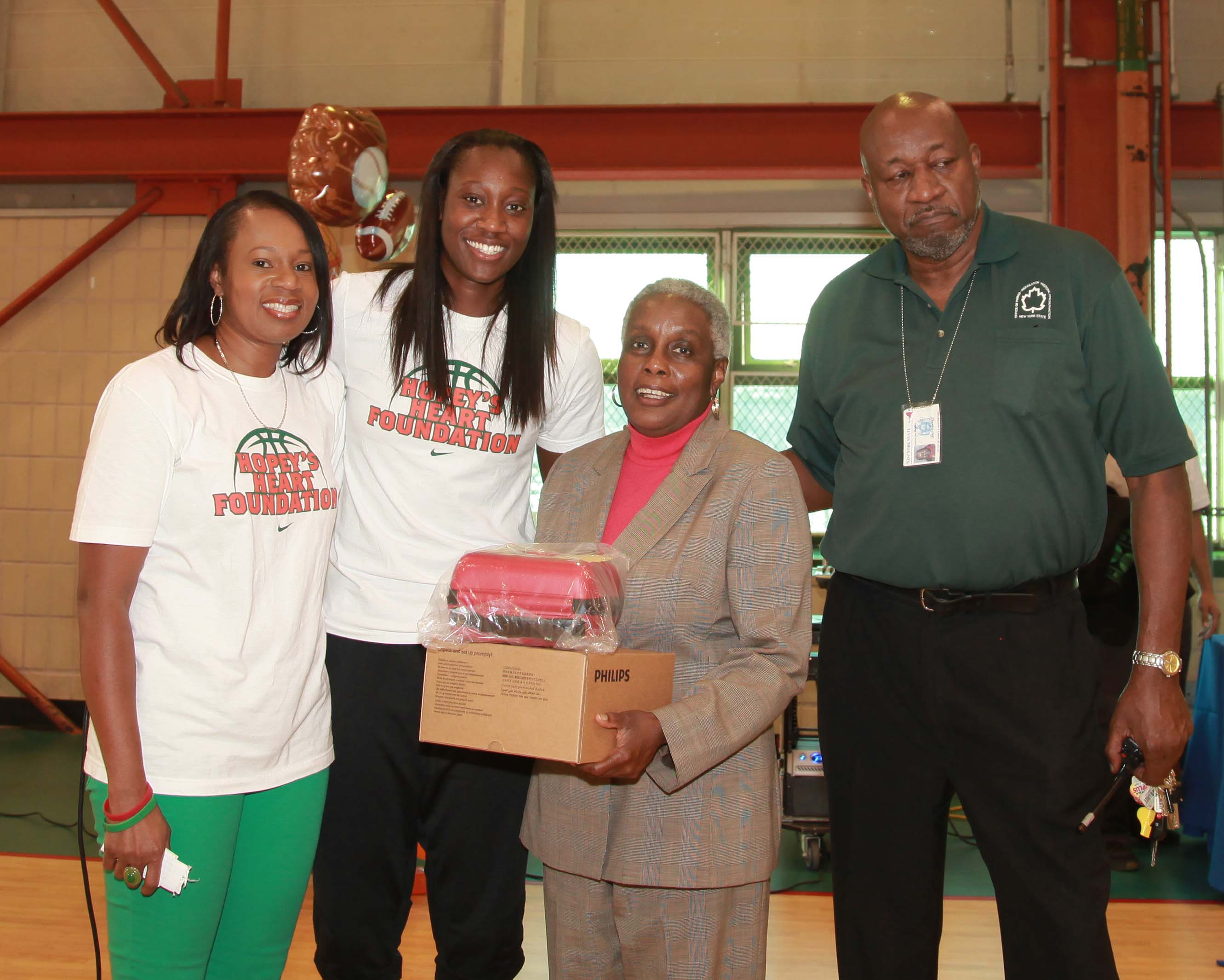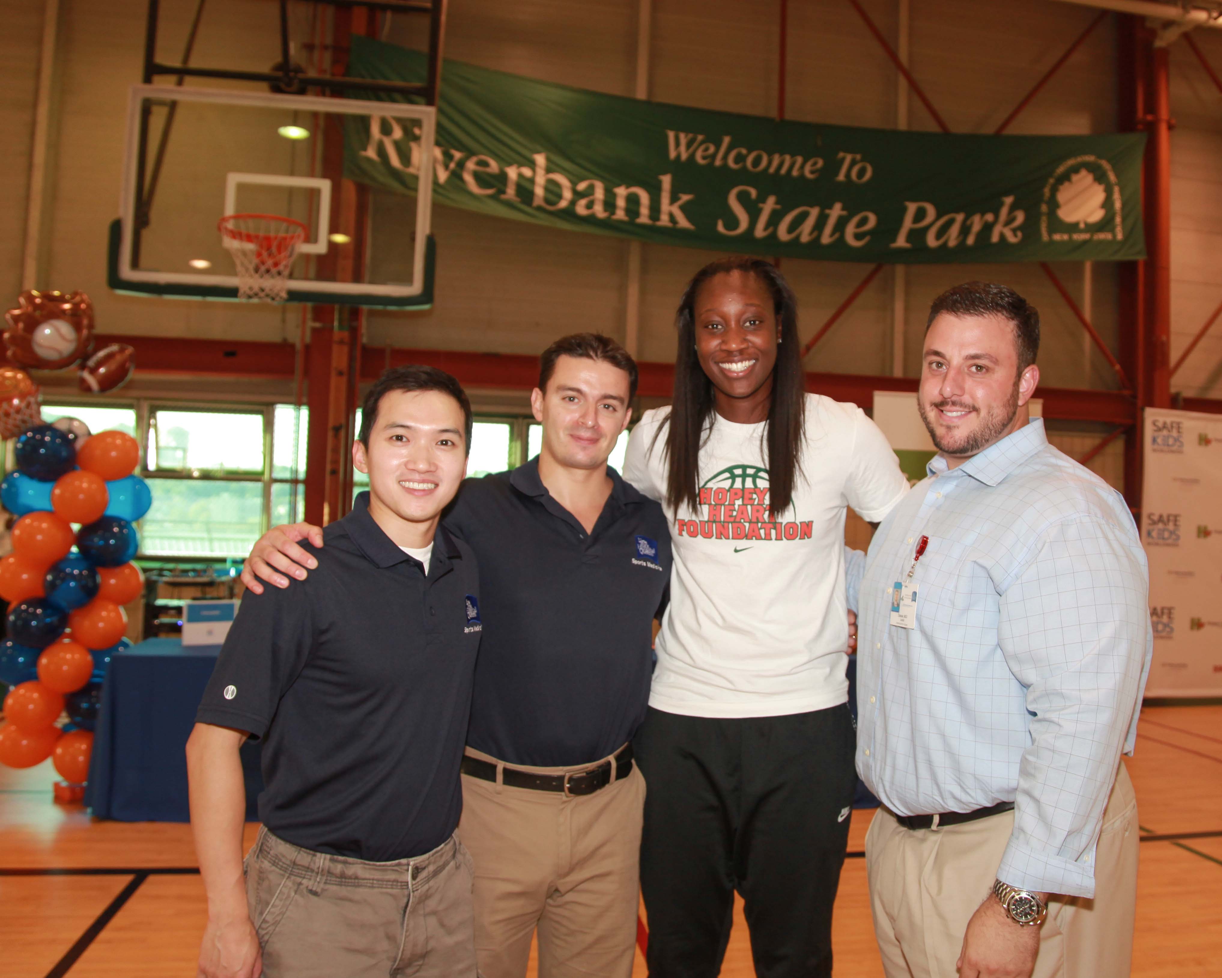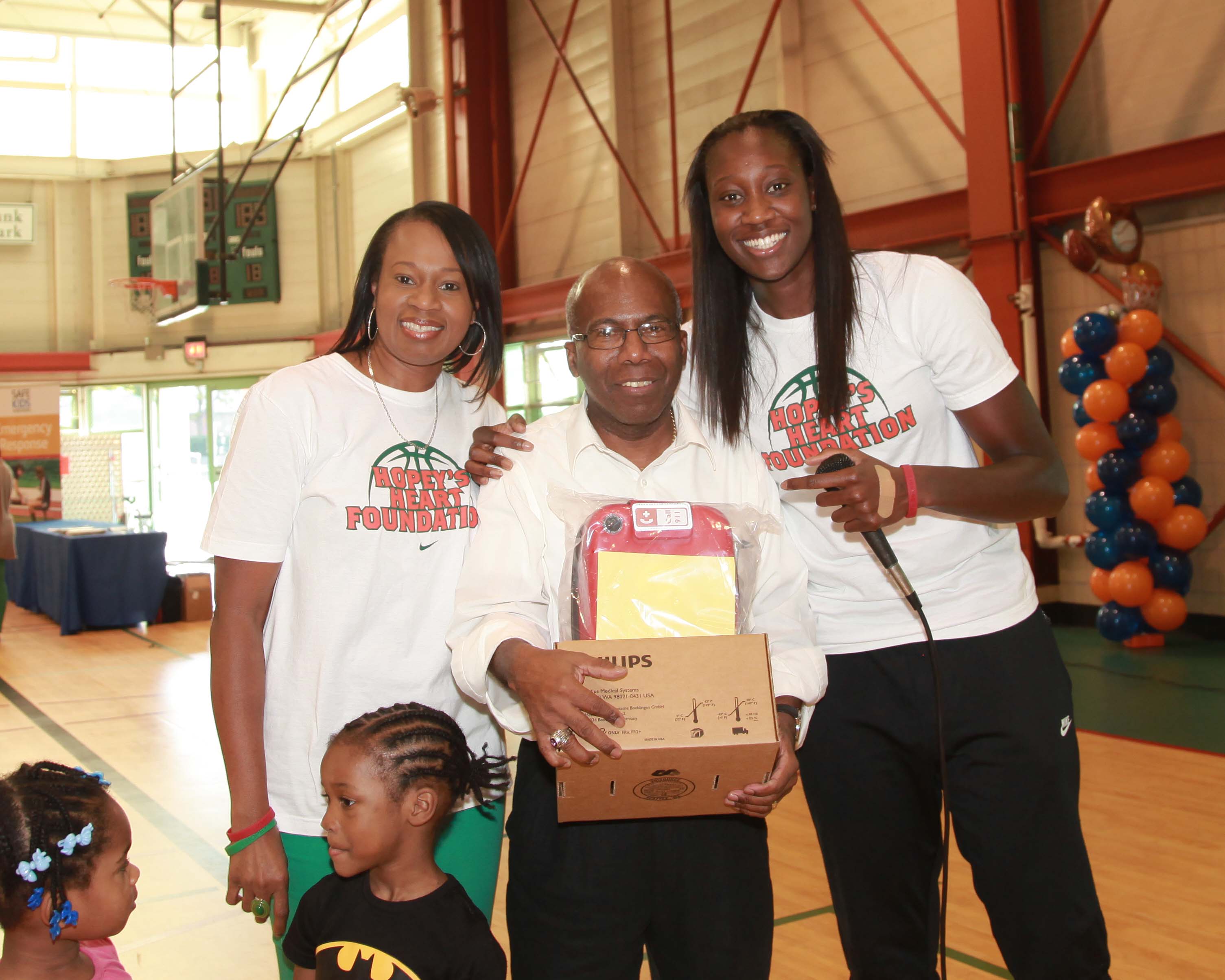 Athletes, coaches and caregivers rotated through a series of 10 minute sessions that focused on key areas of sports injury prevention. Each athlete received an autographed postcard from Tina Charles that had sports safety tips from Safe Kids Worldwide on the back. At the end, Tina Charles and the Hopey’s Heart Foundation donated AED’s to the Riverbank State Park and to Coach Cecil King’s Riverbank N.YGazelles.
